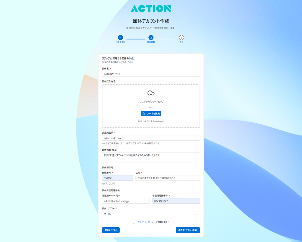 ステップ2:団体情報の登録