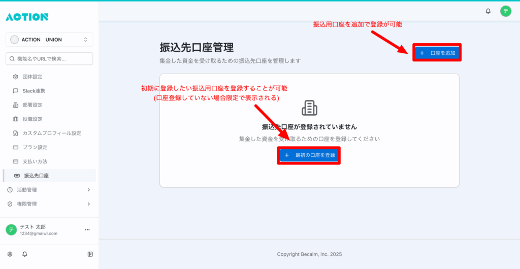 「振込先口座」では、団体が集金した資金を受け取るための銀行口座を登録・管理できます。