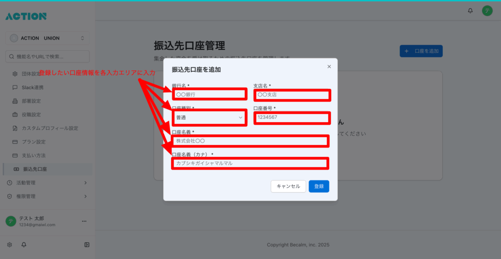 3. モーダルで、銀行名/支店名/口座種別/口座番号/口座名義/口座名義(カナ) を入力します。
