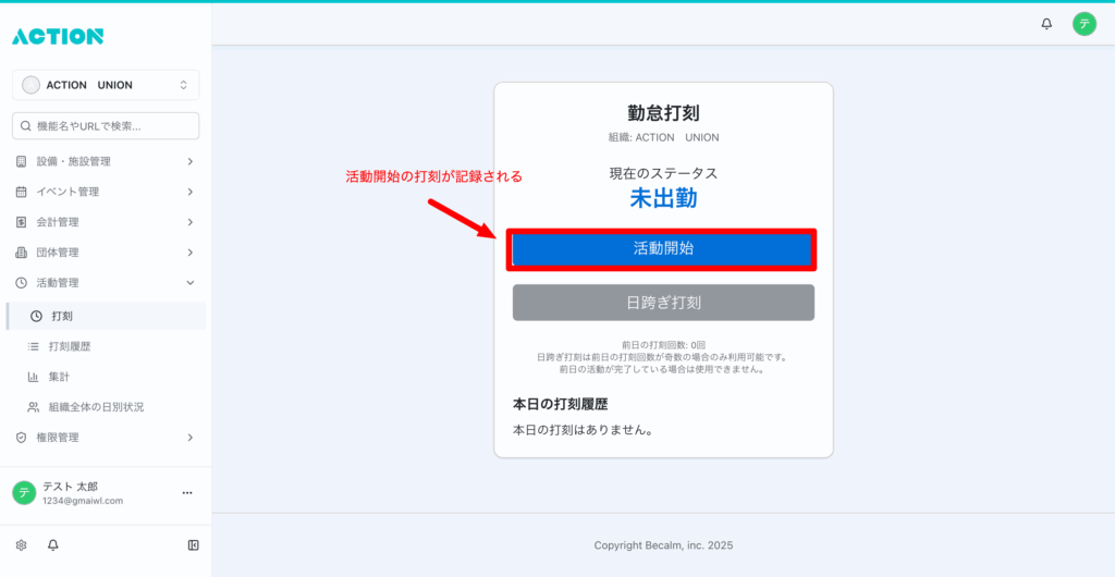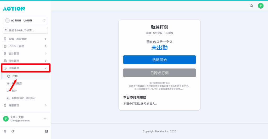 1. 左メニュー 「活動管理」→「打刻」 を開きます。