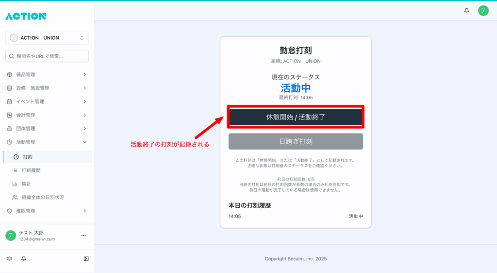 3. 活動を終えるときは、同じ位置の 「活動終了」 をクリックします。