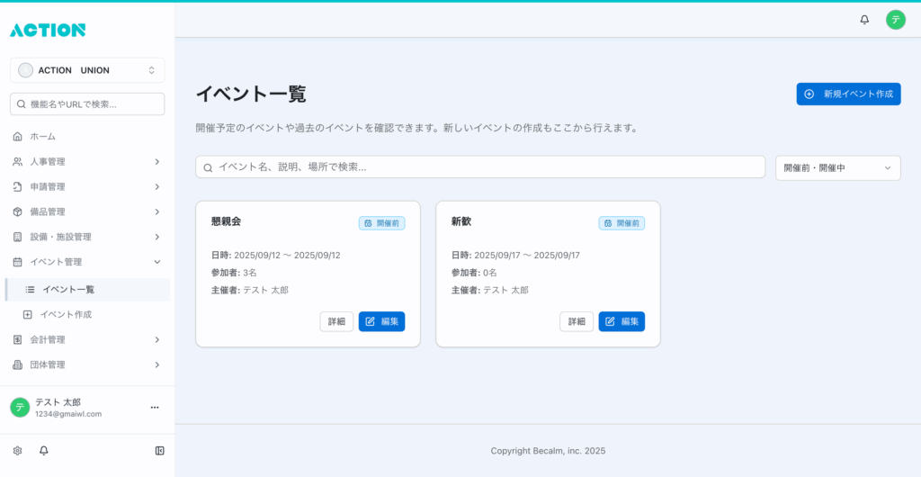 - 新規作成:新しいイベントは、一覧右上の「新規イベント作成」から作成できます(作成手順は別ページ「イベント作成」を参照)。