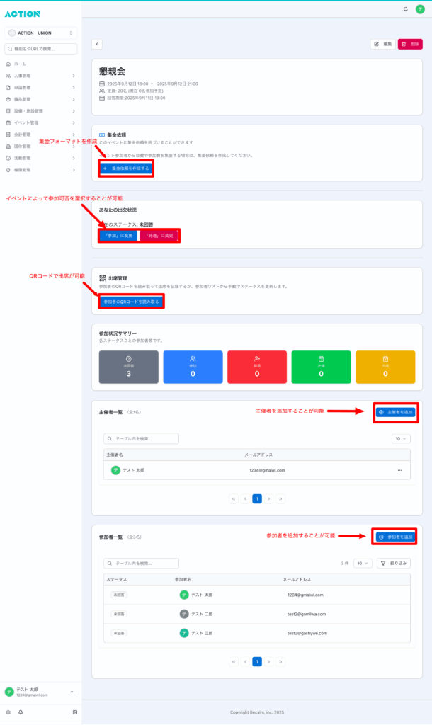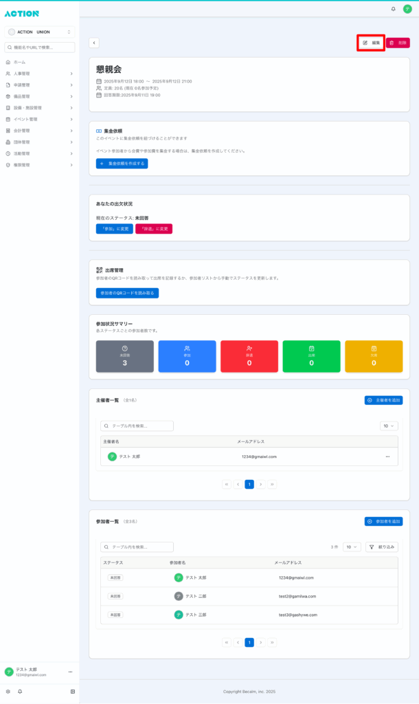 - 権限:詳細での各種操作や編集は、組織の権限設定により制限される場合があります(例:主催者・管理者のみ操作可など)。